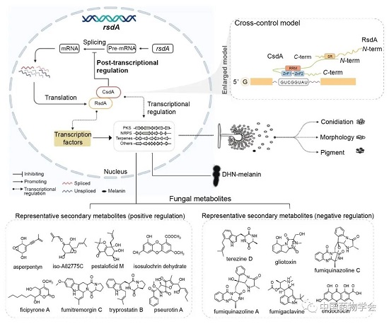 2023年11月14日,中科院微生物研究所尹文兵研究团队在Nature Communications上发表题为“Fungal secondary metabolism is governed by an RNA-binding protein CsdA/RsdA complex” 的研究论文。该研究揭示了RNA结合蛋白与全局调控因子RsdA形成复合体,并在转录后水平控制其表达,介导真菌全局次级代谢变化的新机制,对深入理解真菌次级代谢调控的机制及新颖次级代谢产物的发现具有重要意义。本研究从丝状真菌中鉴定到一个全新的调控真菌次级代谢的RNA结合蛋白CsdA。为研究其调控机制,研究团队通过遗传敲除、转录组学和代谢组学分析,发现CsdA和全局调控因子RsdA能够协同调控真菌的次级代谢。在机制上,揭示了RNA结合蛋白通过与RsdA形成核内复合体,并在转录后水平调控其pre-mRNA剪接从而协调真菌次级代谢的新模式。这种转录和转录后交叉调控的新模式不仅有助于理解复杂的真菌次级代谢调控网络,还为新天然产物挖掘提供了新策略。