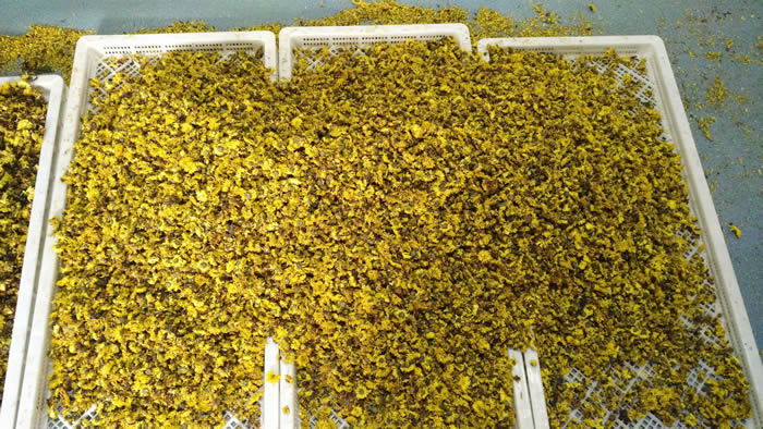 菊花为菊科多年生里草本植物,通常以其干燥的头状花序人药。新鲜菊花含水量较高,其中花瓣部分含水量较少,组织较嫰,容易干燥,而花头部分含水量特大,可达80%以上,且组织较老,不易失水,亦即菊花花头是一种组织极不均匀的药材。干菊花大多用于泡茶饮用,具有味浓香甜、去腻消食、醒脑益神之功能。因此,对于菊花的色、香、形、味要求很高,要求开心干燥后原色、原味、原样,这就要求熟化后烘干,对芘头部分进行强干燥,而对花瓣部分进行弱干燥。而且前先蒸熟后晒干的传统干燥工艺靠天吃饭,而且造成花瓣部分进行过分干燥、瓣片脱落,干燥后的菊花质量达不到要求。金凯菊花烘干机,不仅让客户摆脱了看天吃饭的困扰,烘干出来的菊花完整,不会太分干,颜色鲜亮,是一个环保的解决办法。