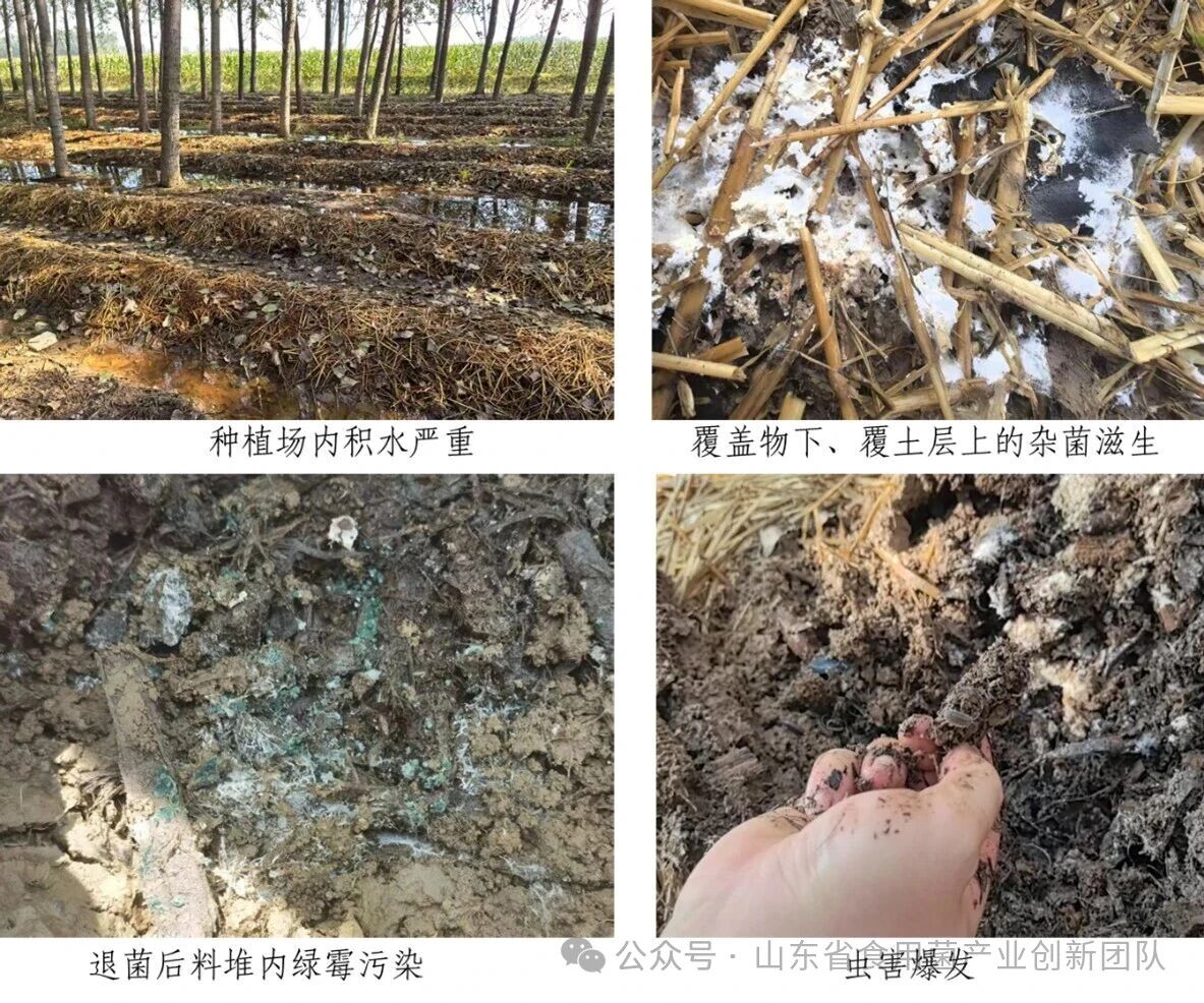 (4)基料淋雨后含水量过高、料温降低,导致菌丝不萌发、生长慢、退菌甚至死亡,并引发鬼伞、木霉等杂菌危害;
