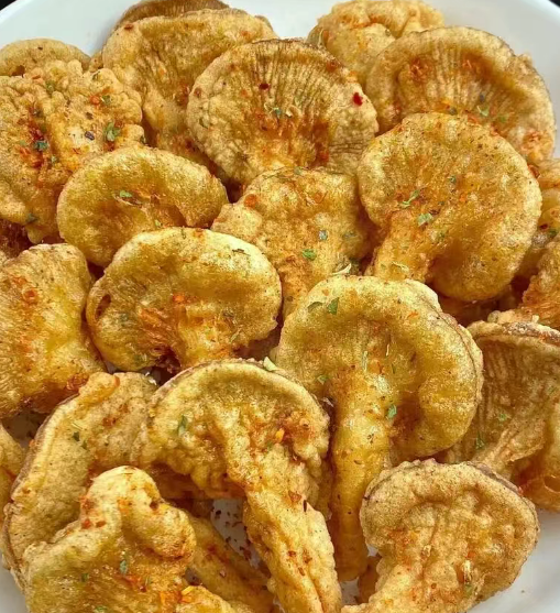 2、放蘑菇入粉浆里打滚,让粉浆裹住蘑菇全身;