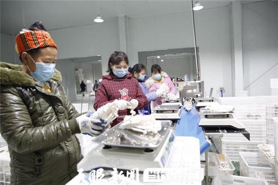 2月10日,来到黔东南州剑河县岑松海鲜菇食用菌工厂内,看到海鲜菇包装车间内,所有的工人都戴着口罩正在半自动化的流水线上,对刚处理完成的海鲜菇进行包装。每个工人都精神抖擞,对工作没有丝毫懈怠。