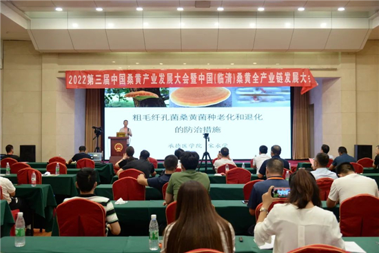 8月13日,2022第三届中国桑黄产业发展大会暨中国(临清)桑黄全产业链发展大会在山东临清举行。在桑黄研究学术研讨会环节,承德医学院副研究员宋永学做了“粗毛纤孔菌桑黄菌种老化和退化的防治措施”的报告。