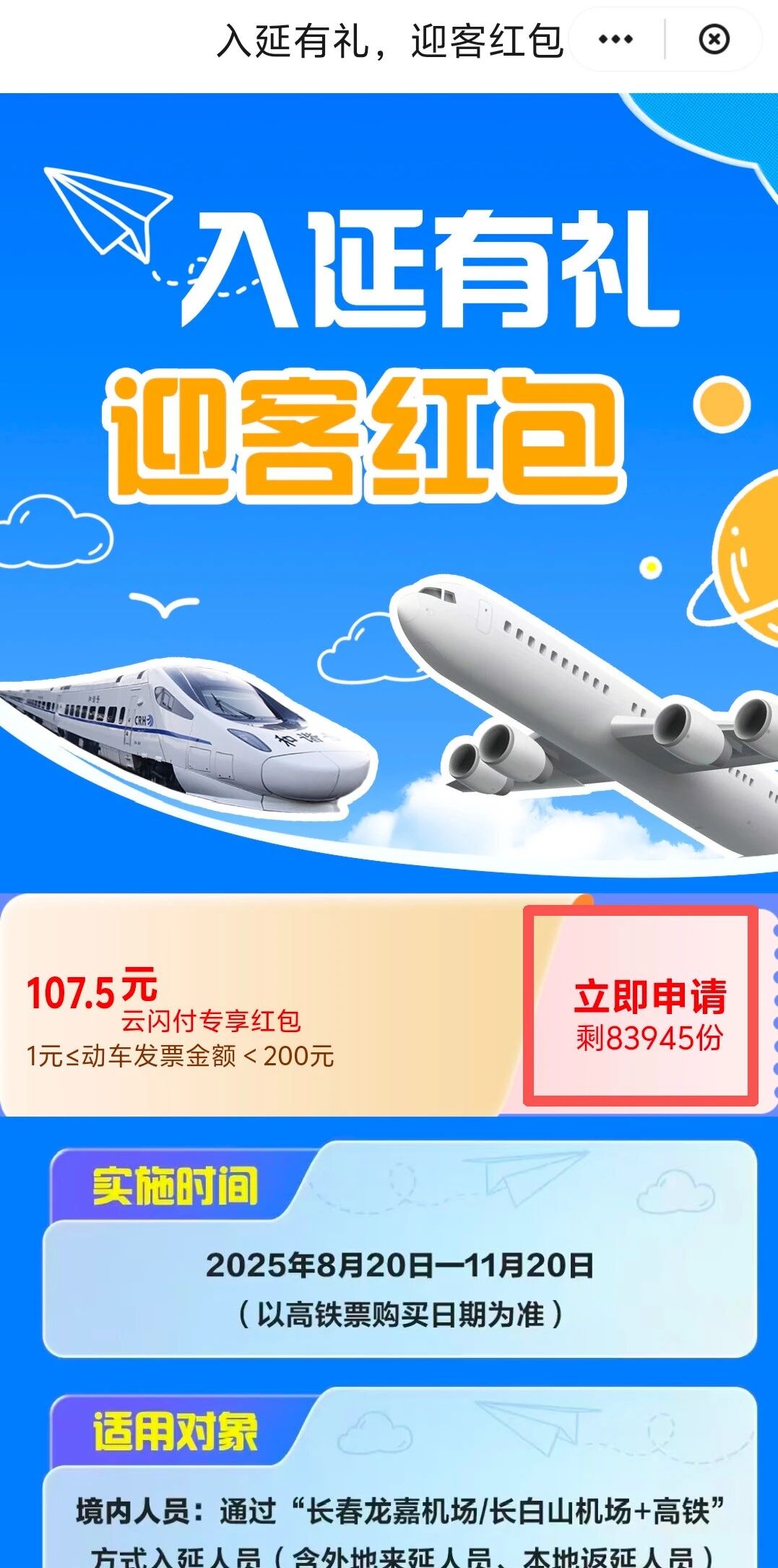 以上机场至延边州内高铁票(需在航班落地24小时内)