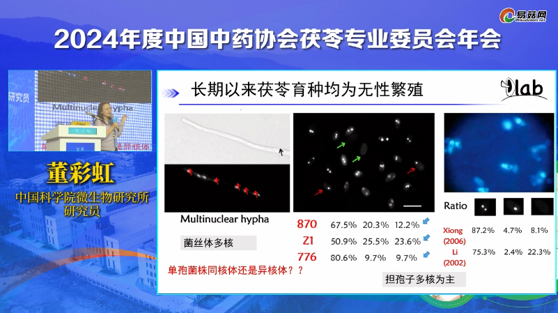她指出,茯苓长期无法开展有性杂交育种,核心障碍在于其菌丝体与担孢子多核、缺乏锁状联合,难以区分同核体与异核体,无法判断杂交是否成功。为突破这一困境,其团队联合湖北省中医院开展了系列研究,首次发现茯苓同核体菌株,利用rpb2片段可精准区分同核体与异核体;结合孢子核荧光原位染色和子实层担子组成,确定茯苓存在二极性异宗配合交配系统;还完成了两种交配型茯苓菌株染色体水平基因组解析,基于mip序列开发出快速鉴定茯苓交配型的分子标记,建立起稳定的茯苓子实体形成条件与同核体杂交育种体系,为有性杂交育种奠定了关键技术基础。