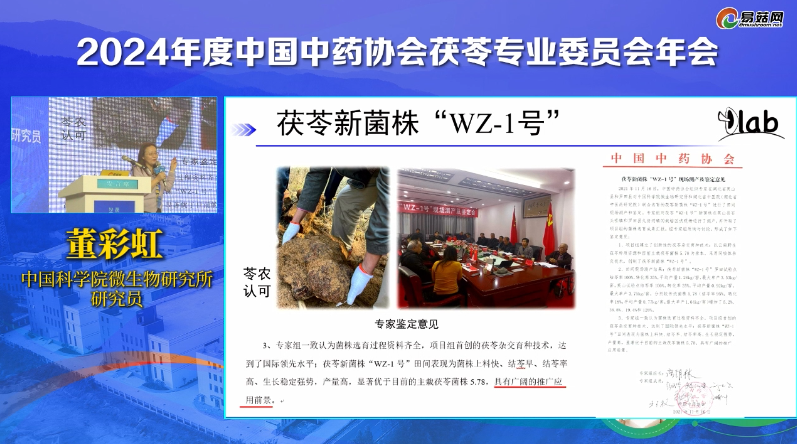 【核心提示】:董彩虹:茯苓新菌株“WZ-1号”菌株上料快、结苓早、结苓率高、生长稳定强势,产量高