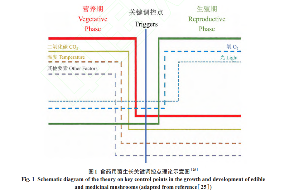 在食药用菌栽培过程中,张树庭根据生长发育期间环境与养分需求的变化规律,提出关键调控点理论(图1)[25]。该理论强调食药用菌生长发育分为营养期与生殖期两个关键阶段,其转换受到各种环境因素的影响,比如CO2、温度、氧气和光照等。不同阶段食药用菌的生长需求是不同的,营养期菌丝体分解基质,积累大量碳源和氮源营养物质,需要合适的温度促进高酶活,但对空气和光照需求低;而生殖期则相反,需充足光照和氧气以诱导子实体形成。关键调控点在于精准把握环境触发时机,避免过早暴露于光照、氧气、水分等因素刺激中,否则影响产量形成所以生产者需要根据科学知识和实践经验,精确控制这个时机,才能获得好的收成;该理论强调科学知识与实践经验的结合,既要理解食药用菌生长的科学原理,又要有实际栽培的经验来把握最佳时机。