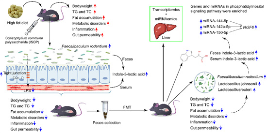 研究人员通过细胞实验、肥胖小鼠模型、粪菌移植、转录组/microRNA组等研究证实了裂褶菌多糖能显著改善饮食诱导的肥胖并抑制脂肪前体细胞3 T3-L1的分化及脂滴积累;其抗肥胖作用可能是通过啮齿粪杆菌/吲哚-3-乳酸/microRNA途径实现的。论文第一完成单位为湖北省农科院农产品加工所,第一作者为殷朝敏副研究员,通讯作者为高虹研究员。该研究得到国家重点研发计划“食用菌高值化利用与减损保质关键技术研发与集成应用”(2024YFD2100800)、湖北省食用菌产业技术体系(2023HBSTX4-09)等项目的资助。