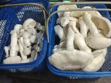 随后的扩大栽培实验成果喜人,同年11月,在仅0.5平方米的栽培面积上,第一潮菇便采摘到5.4斤鲜菇(图6-7)。其个大,菇柄粗壮,高度可达25厘米,菌肉肥厚。现场采摘烹饪品尝,味道鲜美,菇盖滑腻感,菇柄口感口味类似于本地杨树口蘑。
