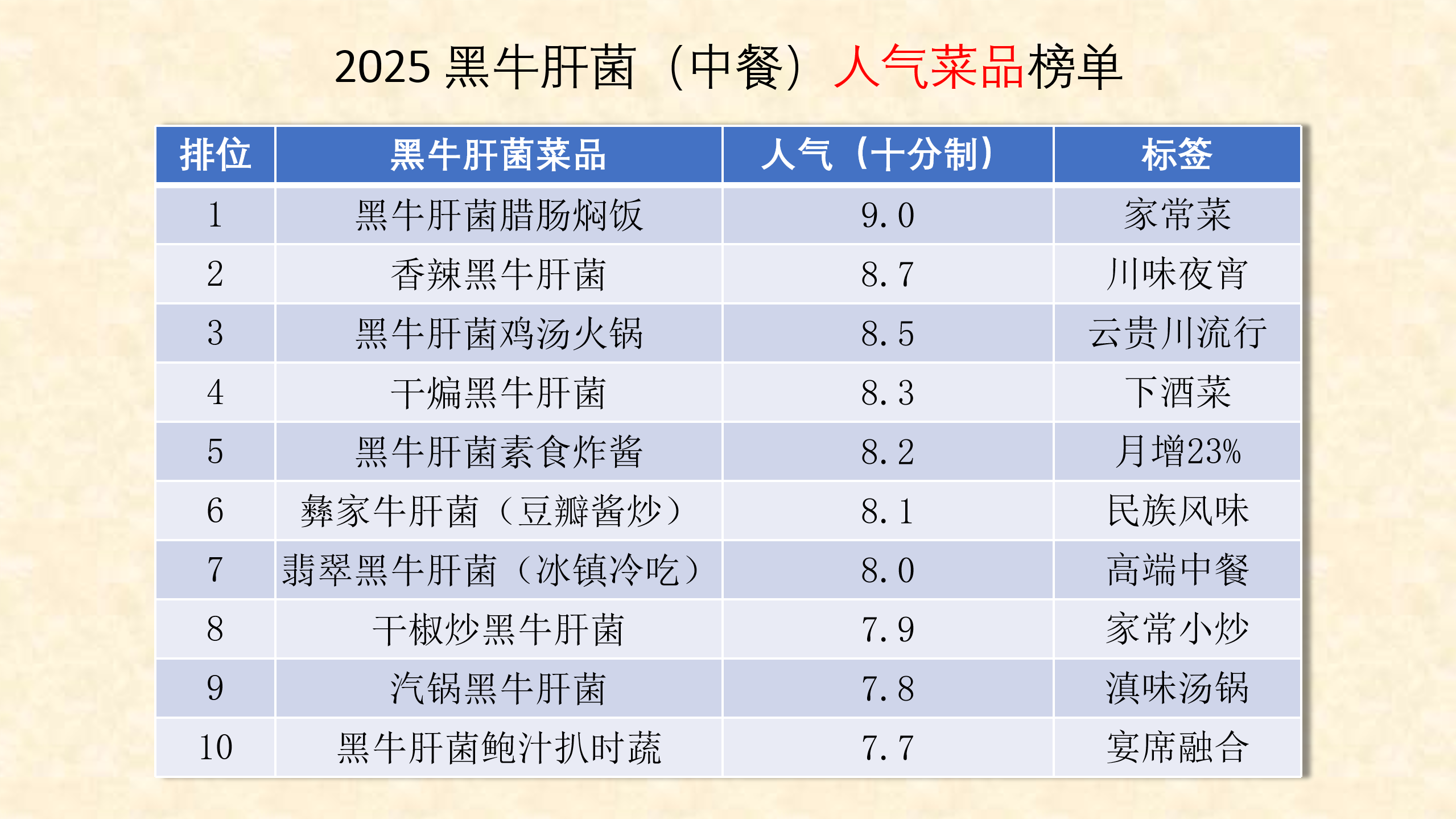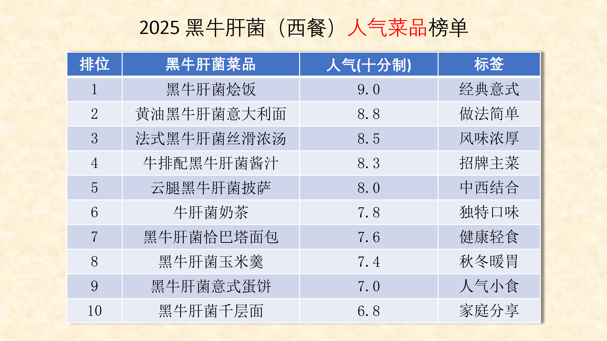 本次榜单的发布,不仅是对当前黑牛肝菌餐饮消费趋势的一次系统梳理,更为餐饮企业、家庭烹饪与食品研发提供了具有参考价值的创新方向。黑牛肝菌正以从家常焖饭到高端宴席、从意式主食到创意饮品的多样形态,展现出强大的食材包容性与场景适应性。