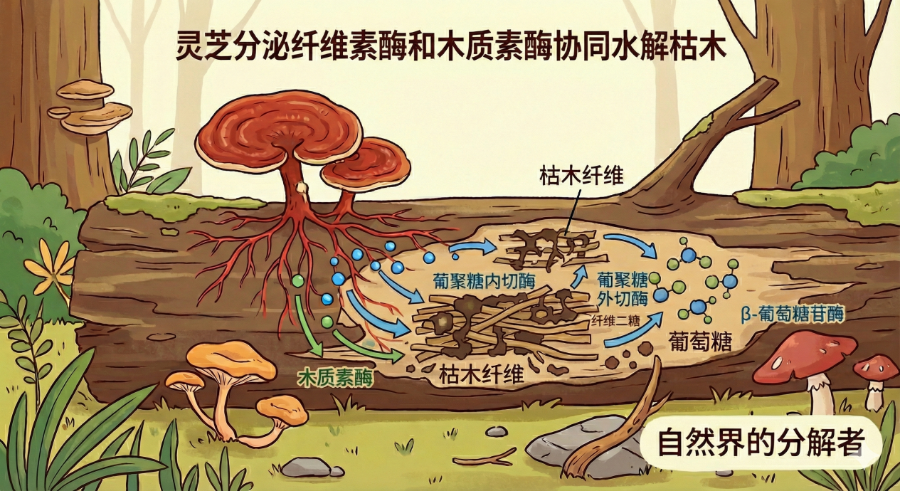 如果我们将视角缩小到微观层面,会发现灵芝的菌丝体在木材内部构建了一个庞大的网络。在这个网络中,灵芝分泌出一套精密的“分子剪刀”——多种高活性的水解酶,它们分工明确,协同作业,从化学结构上瓦解木质素和纤维素。“这套酶系主要包括降解木质素的漆酶、锰过氧化物酶、木质素过氧化物酶,以及降解纤维素的内切葡聚糖酶、纤维二糖水解酶和 β- 葡萄糖苷酶。”其中,漆酶负责氧化分解木质素中的酚类单元,而过氧化物酶则在锰离子等辅助因子的参与下,直接裂解木质素复杂的非酚类结构。而纤维素降解酶系有内切葡聚糖酶,纤维二糖水解酶和β-葡萄糖苷酶。内切葡聚糖酶像“内部切割师”,随机切断纤维素长链内部键结,将其破解为较短链段;纤维二糖水解酶则充当“末端处理器”,从暴露出的链末端持续切下纤维二糖单元;最后,β-葡萄糖苷酶作为“终产物转化者”,将纤维二糖彻底水解为葡萄糖单体。这套完整的酶系统通过精密的团队协作,成功将顽固的纤维素大分子转化为可被吸收利用的简单糖类。正是凭借这套生化“武器库”,灵芝得以在其他微生物难以生存的硬木基质中占据独特的生态位,将枯木转化为自身的营养。