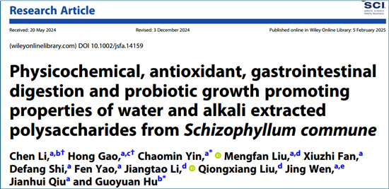 在国际学术期刊《Journal of the Science of Food and Agriculture》(IF=3.5)上发表了题为“Physicochemical, antioxidant, gastrointestinal digestion and probiotic growth promoting properties of water and alkali extracted polysaccharides from Schizophyllum commune”的研究论文,揭示了水提和碱提裂褶菌子实体多糖体外消化规律及其促益生菌增殖作用。