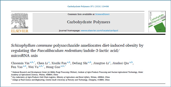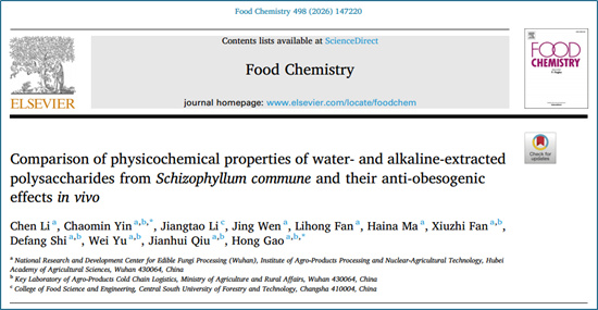 在权威学术期刊《Food Chemistry》(中科院一区,IF=9.8)上发表了题为“Comparison of physicochemical properties of water- and alkaline-extracted polysaccharides from Schizophyllum commune and their anti-obesogenic effects in vivo”的研究论文,首次报道了裂褶菌子实体多糖在动物体内良好的抗肥胖及调节肠道菌群作用。