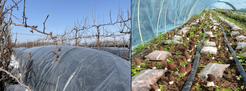 果园套种羊肚菌栽培模式通过利用果园冬季休眠期土地闲置资源,结合简易设施栽培羊肚菌,实现“一地多用”。该模式已在西安市鄠邑区、长安区、周至县成功推广,亩产值可达2.1万元~7.5万元,填补冬季鲜菇市场空缺,形成“果菌共生”的循环农业体系。具体技术要点如下: