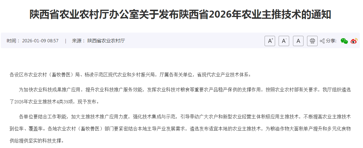 近日,陕西省2026年农业主推技术名单公布,涵盖粮油生产、特色产业、畜牧兽医、耕地环保四大类别共39项技术,为全省粮食稳产保供、农业提质增效和乡村产业振兴装上“科技引擎”。