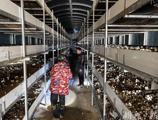 1月12日,武汉市新洲区徐古街许易村的武汉金新农生态农业有限公司(以下简称为金新农)内,双孢菇生产的关键环节——出菇管理正在精准进行。智能菇房内,适宜的湿度让朵朵双孢菇洁白饱满;菇房外,村民们手持花洒,细致地为覆土层补水,以精准调控湿度,诱导菌丝生长、形成菇蕾。