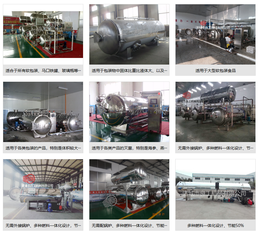 公司旗下还拥有免锅炉多功能节能环保一体化杀菌锅/灭菌柜、新型燃气、燃油式节能环保免锅炉杀菌锅/灭菌柜、多功能节能环保产汽罐、各种型号电脑程控全自动调理式杀菌锅、电脑程控全自动双层热水循环调理式杀菌锅、电脑程控全自动双锅并联型杀菌锅、F0值高效水浴式灭菌锅、F0值喷淋调理式灭菌锅、半自动双层热水循环型杀菌锅、单层半自动(手动)卧式杀菌锅、半自动(手动)电汽两用杀菌锅,全自动(半自动)燃油式杀菌锅、旋转式杀菌锅、各种食用菌的漂烫、巴式杀菌流水线,可倾式、固定式夹层锅、真空冻干机、多糖等提取罐、精制设备等五大类,三十大系列,二百多个型号的产品。