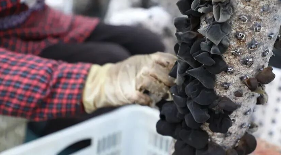 采收后的湿木耳晾晒脱水后,被运往工坊加工区,经过机器筛选分级、碎渣剔除等多道工序后,工人们再进行人工二次挑选,确保每一颗木耳都符合优质标准。