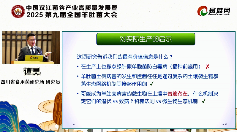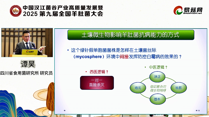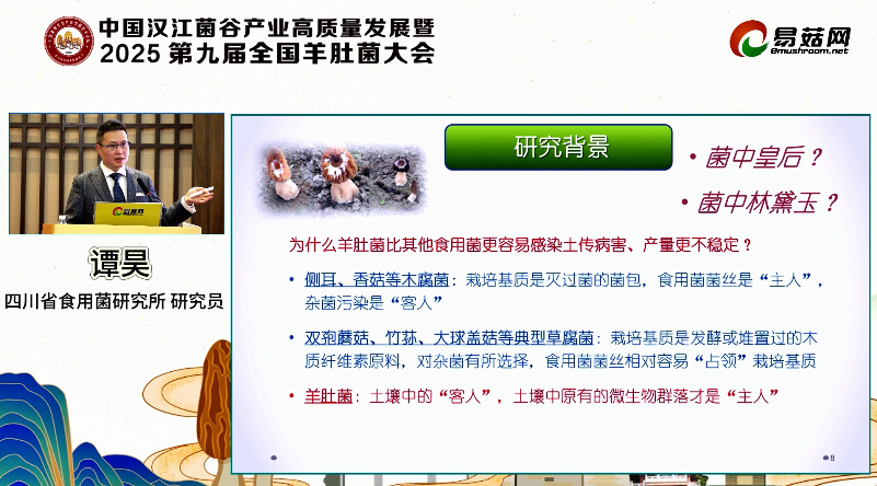 “白霉病已成为制约羊肚菌产业发展的头号威胁,连作土壤中病害爆发尤为频繁,导致产业规模难以持续扩张。”四川省食用菌研究所谭昊研究员作了题为基于土壤微生物生态原理的羊肚菌白霉病绿色防控研究的报告分享,内容聚焦覆土栽培食用菌产业的核心痛点,通过解析土壤微生物生态网络机制,为羊肚菌土传病害防控提供了全新的理论支撑与实践启示。