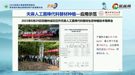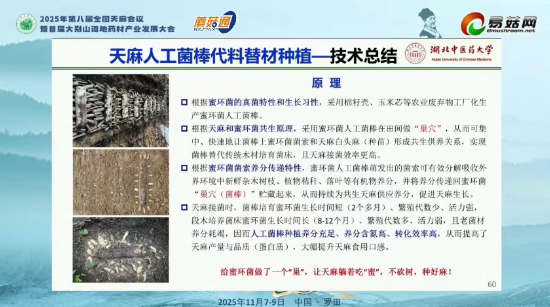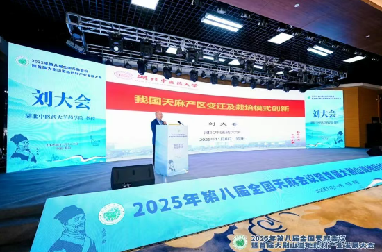 在“2025年第八届全国天麻会议暨首届大别山道地药材产业发展大会”上,湖北中医药大学教授刘大会作了题为“我国天麻产区变迁及栽培模式创新”的报告,系统梳理了天麻在我国长达两千余年的产区变迁史、栽培产区、栽培模式,并重点介绍了具有突破意义的天麻人工菌棒代料种植技术。
